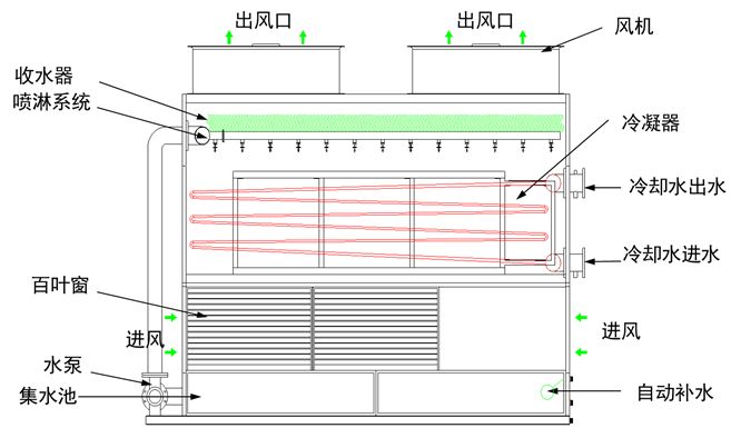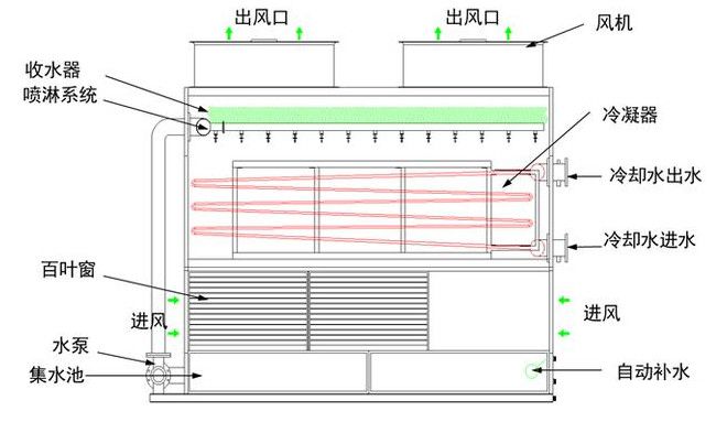 封閉式冷卻塔(也稱為蒸發(fā)式空氣冷卻器、封閉式冷卻塔或封閉式冷卻塔)將管狀熱交換器放置在塔內,通過循環(huán)空氣的熱交換、管道外的噴水和管道內的循環(huán)水確保冷卻效果。由于循環(huán)水在管道中封閉,可以保證水質不受污染