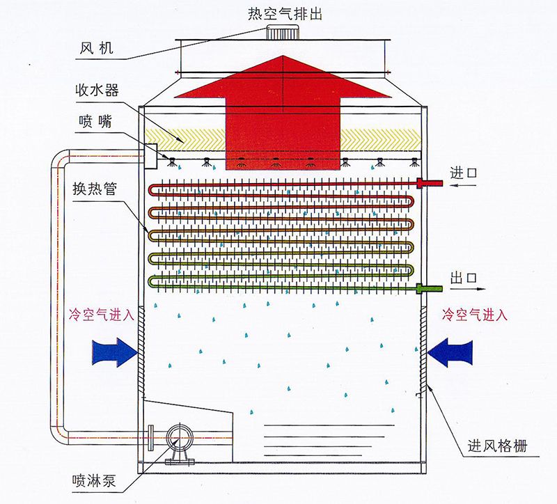 由于節(jié)能減排政策的實施以及水資源的日益緊缺,閉式冷卻塔在冶金、電力、機械加工、空調等行業(yè)得到了廣泛應用,其性能優(yōu)勢得到了充分體現(xiàn)。封閉冷卻塔又稱蒸發(fā)式空冷器、密閉式冷卻塔或封閉式冷卻塔,管式熱交換器位
